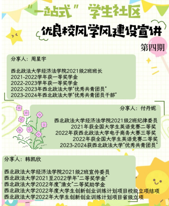 学风是读书之风,是治学之风,更是做人之风。优良的学风是激励大学生奋发向上、锐意进取、开拓创新的强大精神力量。6月5日中午,本科生第二党支部采取线下会议的方式组织开展第四期优良校风学风建设宣讲会。此次邀请2021-2022学年度、2022-2023学年度获一等奖学金、2023-2024年西北政法大学“优秀共青团员干荣誉获得者2021级2班周星宇;2021年、2022年获全国大学生英语竞赛二等奖、2022年获西北政法大学电子商务大赛三等奖获得者2021级2班付丹妮;2022年度大学生创新创业训练计划项目校级立项结项、省级立项、2022年度“渔女”二等奖助学金获得者2021级2班韩凯欣进行宣讲。