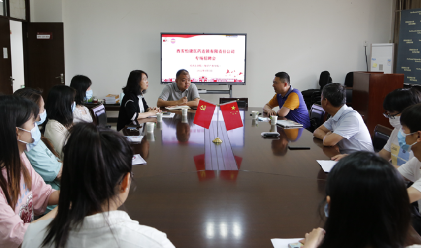 (知识产权学院)在学院资料室举办了西安怡康医药连锁有限责任公司专场招聘会。西安怡康医药连锁有限责任公司招聘部部长魏铁军、招聘主管雷昭君、学院党委书记李建梅、党委副书记李慧军、毕业年级辅导员张兴浩及部分2022届毕业生参加了此次宣讲招聘会。