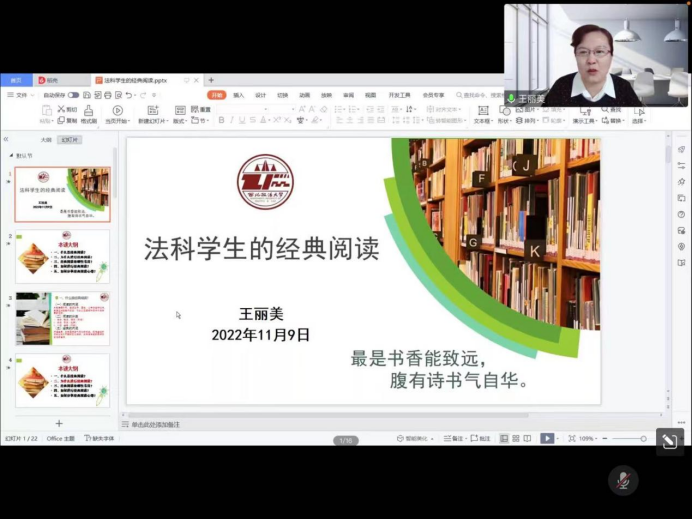 王丽美副教授分别从“什么是经典阅读?”、“为什么进行经典阅读?”、“经典阅读有哪些书目?”、“如何进行经典阅读?”、“如何分享经典阅读心得?”五个方面分别展开详述。王丽美副教授提到“读万卷书,行万里路”学生应该通过阅读获取文字背后的奥妙,使同学们明晰了该如何从经典法科书目阅读中打开法学殿堂的大门,培养自己的法学思维。