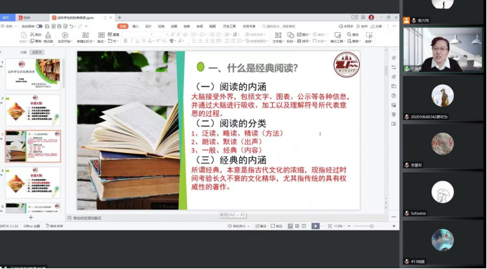 首先就“什么是经典阅读?”,王丽美副教授从“阅读的内涵”、“阅读的分类”以及“经典的内涵”三个方面作出了回答与解释。其次对于“为什么进行经典阅读?”,王丽美副教授指出一是时间的稀缺性,二是经典乃独立精神、自由思想之载体,三是站在巨人(大师)的肩上,四是书中自有颜如玉,书中自有黄金屋,五是读书破万卷,下笔如有神这五点,并结合生活实际进行了生动的解释。再次,王丽美副教授就“经典阅读有哪些书目?”进行了分享。王丽美副教授根据自己学生时代的经验,结合大一新生实际,认为在没有太多专业知识储备的情况下,建议可先不必阅读太过于专业的书籍,应先从经典入手,启发思想。因此,王丽美副教授推荐了法学类、经济学类、社会学类、历史类、哲学类以及文学类经典书籍,并指出,涉猎领域广泛是法学生应该做到的。接着王丽美副教授谈到“如何进行经典阅读?”为我们介绍了阅读方法和阅读顺序。最后王丽美副教授提出“最是书香能致远,腹有诗书气自华”,在晨星读书会第53期之际,欢迎大家加入读书会,学习阅读,从此热爱阅读,并最终能受益于阅读。
