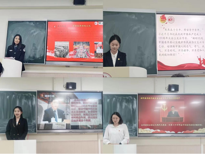 姚朵朵同学谈到,我们的文化自信要放眼未来,环视世界。通过当下新时代中国特色社会主义的文化实践赋予其崭新的发展活力与时代意义。艾欣羽同学鼓励同学们要持续在学懂弄通做实的创新理论上下功夫,实现知行合一。赵璐同学向大家介绍中国特色社会主义法治道路,强调在法治轨道上全面建设社会主义现代化国家的重要性。郜若彤同学热情呼吁让青春在新时代改革开放的广阔天地中绽放,要努力成为德智体美劳全面发展的社会主义建设者和接班人。
