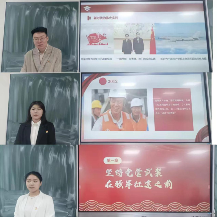 随后,吴政祎同学表示新时代必须要坚持和完善“一国两制”,中华民族必然绘就同心圆,共筑中国梦!曹译丹同学带领大家回顾了党在新时代十年取得的伟大成就,明确实现中华民族的伟大复兴进入不可逆转的历史进程的深刻时代内涵。刘佳蕊同学强调国家安全是民族复兴的根基,社会稳定是国家强盛的前提,必须坚定不移贯彻总体国家安全观,建设更高水平的平安中国。