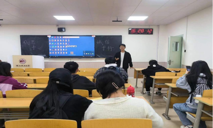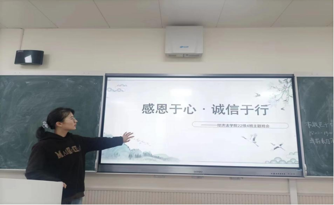 在学院组织下,各班以“感恩于心,诚信于行”为主题开展班会,各班积极带领同学们深刻领悟感恩与诚信的重大意义以及对其的认识,呼吁同学们怀感恩之心,行诚信之事,做美德青年,同时同学们也对此进行了积极的讨论,让感恩与诚信的美好品德在同学们心里落地生花。各班还充分发挥主观能动性,创新出一系列的活动内容。班级同学们进行校园采访活动,调查学校师生对诚信感恩的理解并分析数据。结合专业所学,将诚信教育与法庭活动相结合,以班级为单位组织模拟法庭活动。班干部还带领同学们共同合唱关于感恩的歌曲、故事交流、观看相关视频、制作班级留言墙、进行“诚信于行”的情景剧和各种游戏环节等加深了同学们对诚信与感恩的认识与理解。