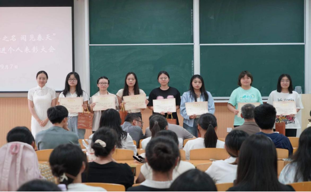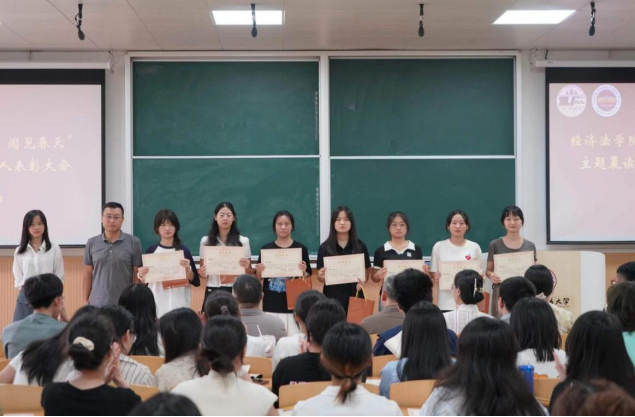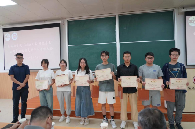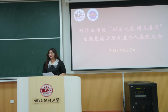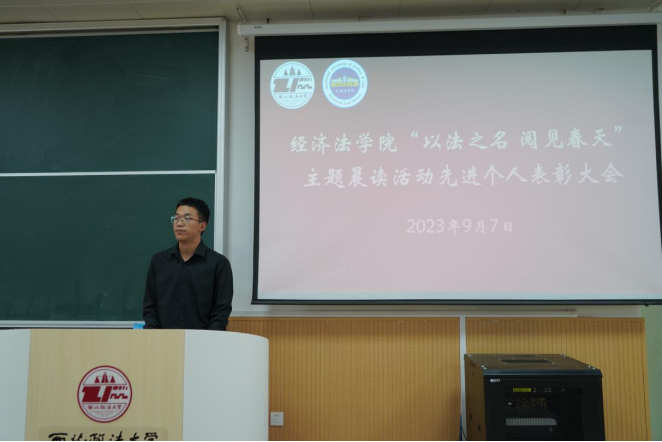 9月7日中午,经济法(知识产权)学院“以法之名,阅见春天”主题晨读活动先进个人表彰大会于天平楼BJ22教室成功召开。学院党委副书记李慧军、学院党委组织员李小斐、学院团委书记王文、学院团总支书记李冬冬、2020级辅导员来沅晖、2023级辅导员王可卓以及荣获晨读先进个人的50名同学参加大会,大会由团总支书记、2022级辅导员张兴浩老师主持。