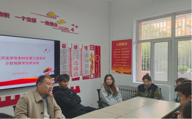 本科生第三党支部在14号学生公寓楼“一站式”社区工作室召开民族学生座谈会。学院少数民族同学参加交流座谈,党支部书记张兴浩主持会议。
