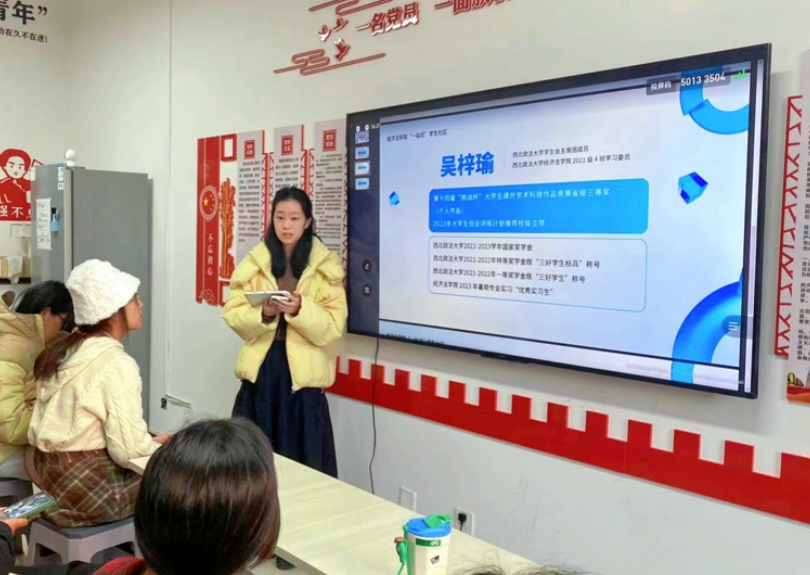 (知识产权学院)在14号公寓楼“一站式”学生社区开展创赛经验分享会。活动自通知发出后,吸引了来自不同学院的各个年级学生积极报名参加。分享会采取线上线下相结合的方式进行。2021级9班潘姿蓉负责组织协调本次活动并主持分享会。