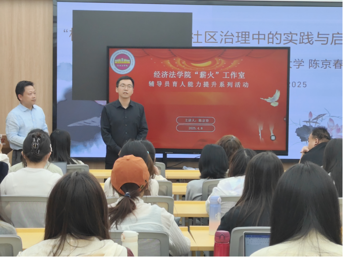 (知识产权学院)在枫桥一站式中心举办第三期辅导员育人能力提升系列活动。活动邀请到国家安全学院陈京春教授,他以《“枫桥经验”在学生社区治理中的实践与启示》为主题进行授课。学院党委书记李建梅、副书记李恒、全体辅导员及学生骨干共同参加活动。