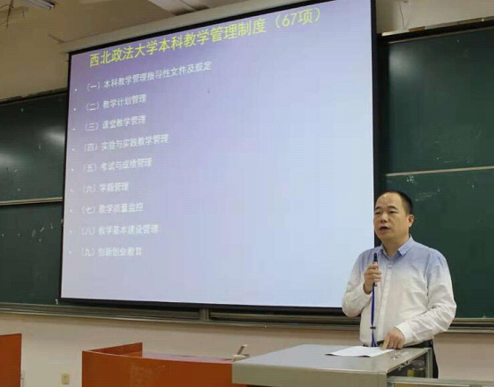 第一阶段在举行了简短的欢迎新同学仪式后,张天栋副处长凭借多年教学管理的经验从《西北政法大学本科教学管理制度》谈起,对大学生在校期间如何进行课程设置、选课标准、学业考核以及转专业四个方面的规章制度进行了详尽的说明与解释,特别向同学们强调了我校关于加强本科教育的一些新举措,如取消清考,严格考试纪律、加强学习过程考核等制度。张天栋副处长的言辞周正而诚挚,所讲内容充分体现了学校对本科教育的高度重视,最后还引用了习近平总书记在北大师生座谈会上对广大青年的四点期望:“一是要爱国,二是要励志,三是要求真,四是要力行”,对在座新生直观地提出了在学业及生活方面的具体要求,透彻地理清了学生身心发展的正确方向和光明未来的落实基础。