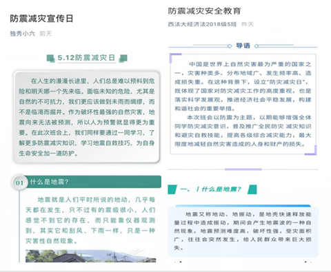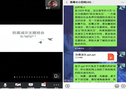 为落实“防震减灾”安全教育学习情况,增强活动的实效性,学院要求各班级召开“防震减灾”安全教育线上班会,并充分利用微信公众号等多种形式将安全自救知识进行广泛传播与扩散。此次活动的开展,同学们更好地了解到防震减灾方面的知识,为处理突发状况奠定了良好的应急基础。