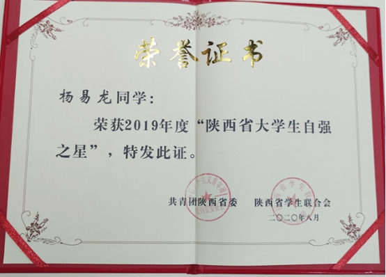 杨易龙同学荣获“陕西省大学生自强之星”的称号。
