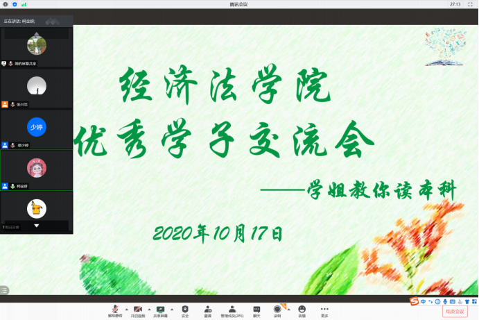 为帮助2020级新生对崭新的大学生活全面的了解和认识,尽快适应大学生活,加快转换角色,对未来大学生活进行全面规划。10月17日晚19:00,英超直播88 在腾讯会议开展优秀学子线上交流会。英超联赛88直播 2020届优秀毕业生岳东冉、柯金妍、王淑瑶、蔡少婷进行经验分享,全体2020级新生参加交流会,交流会由2020级辅导员张兴浩主持。