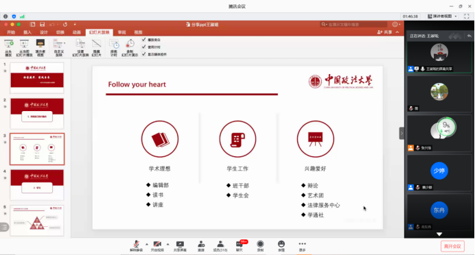 首先,推免至华东政法大学政的柯金妍分享了对于大学四年总体规划的分享,并就她在大学生活中在学习和生活方面遇到的问题及解决方法进行了细致阐述,其中包括开学的适应问题、英语四六级的备考与复习以及参加大学生创新创业项目和“互联网+”等活动的方法和必要性,并建议学弟学妹一定要做好自己的学习规划,走好大学四年的每一步。