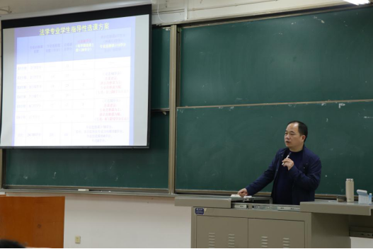 张天栋副处长为同学们介绍了我校的本科教学组织、15个院部的课程设置、课内外学习时间要求以及毕业总学分的分布情况等四个方面的内容,对专业必修课开课学期一览表进行了详细说明,并重点强调了大学英语课的设置情况以及英语和计算机课试行“以考代修”制度所需注意的问题。同时,在“通识选修课”设置和法学毕业学生指导性选课方案两个方面,他指出其中的重点和难点,并进行了具体解释。