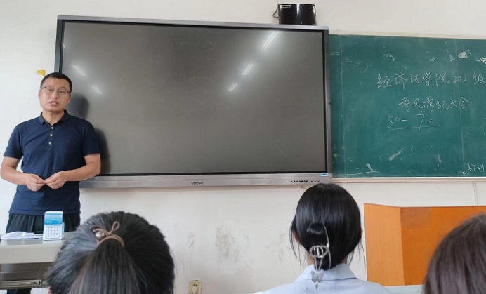 (知识产权学院)组织2021级学生在长安校区天平楼A302召开本学期考风考纪宣讲大会,会议由2021级7班班长金效田同学主持,辅导员李冬冬参加会议。