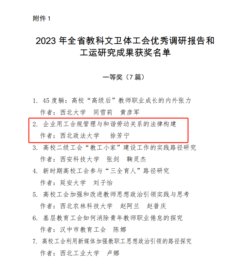 日前,评审结果揭晓,共评出一等奖7篇、二等奖22篇、三等奖31篇。英超联赛88直播 劳动与社会保障法教研室徐芳宁副教授的研究成果《企业用工合规管理与和谐劳动关系的法律构建》荣获一等奖。