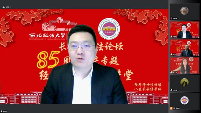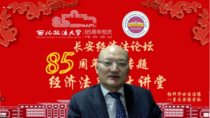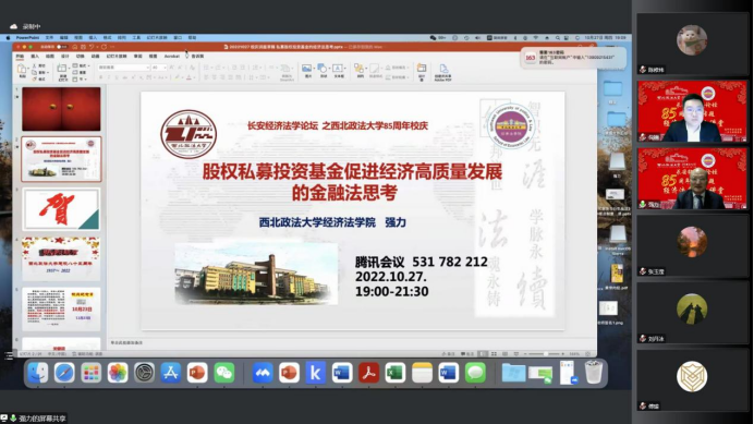 (知识产权学院)承办的第二百一十九期长安经济法学论坛暨八十五周年校庆专题经济法名家大讲堂于线上举行。本期论坛特邀西北政法大学经济法(知识产权)学院教授、博士生导师、中国法学会银行法学研究会副会长、中国法学会经济法学研究会常务理事、中国法学会证券法学研究会常务理事、陕西省法学会金融法学研究会会长、陕西证券基金业协会监事长、陕西省人大常委会立法专家咨询委员强力教授为主讲人,发表题为《私募股权投资基金助力经济高质量发展的金融法理念与路径》的主题演讲。