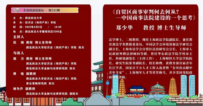 (知识产权学院)承办的长安经济法论坛第231期于西北政法大学雁塔校区三号教学楼3506室举行。本期学术论坛特邀上海政法学院副院长,二级教授、博士生导师郑少华教授发表主题为《自贸区商事审判何去何从?——中国商事法院建设的一个思考》的演讲。
