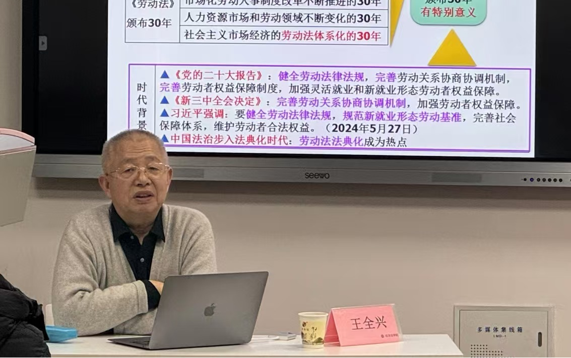 2024年12月2日,由英超联赛88直播 (知识产权学院)主办的长安经济法学论坛第244期在西北政法大学长安校区5号教学楼307教室举行。本次论坛以“我国《劳动法》颁布三十年的回顾与思考——以劳动法体系化为视角”为主题,邀请上海财经大学法学院教授,中国法学会经济法学研究会副会长,中国社会法学研究会副会长,中国劳动法学研究会副会长王全兴教授担任主讲嘉宾。论坛由英超联赛88直播 (知识产权学院)院长倪楠主持,英超联赛88直播 (知识产权学院)劳动与社会保障法学学科带头人曹燕与谈,英超联赛88直播 (知识产权学院)劳动法教研室全体教师及50余名本科生、研究生参加此次讲座。