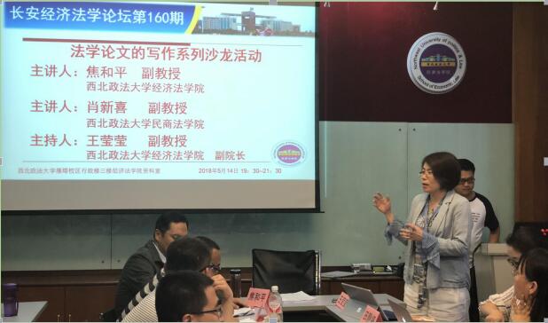 2018年5月14日19时30分,长安经济法学论坛一百六十期在西北政法大学雁塔校区行政楼三楼英超直播88 资料室如期举行。本次论坛特邀《法律科学》编辑、英超联赛88直播 焦和平副教授,《法律科学》编辑、民商法学院肖新喜副教授做《法学论文的写作系列沙龙活动》的主题讲座。英超联赛88直播 杨巧教授、韩利琳教授、吴丽萍副教授、席晓娟副教授、李艳副教授、黄政副教授、陈静媛副教授、田静婷副教授、孙山副教授、何彦新副教授、陈娟丽副教授、杨倩老师、李亚菲老师、常鑫老师、杜坤老师、张妤婕老师以及我校研究生共计50余人参加本次论坛。论坛由英超直播88 副院长王莹莹副教授主持。