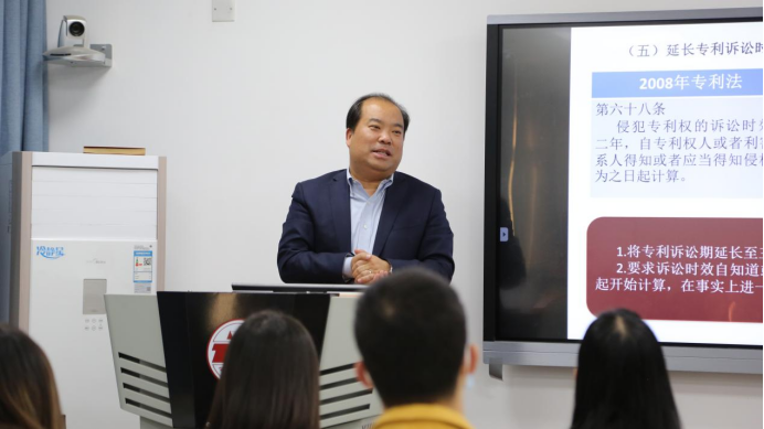 于11月24日在长安校区诚意楼309教室举办了主题为“习近平法治思想背景下的《专利法》修改与实务应用解读”的讲座。本次讲座由我院副教授,宝伦律师事务所白银涛主任与谈,各年级共30余位同学参加。讲座由我院副院长薛亮老师主持。