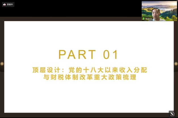 学术报告阶段,刘剑文教授紧扣共同富裕和财税立法两个主题,首先通过对党的十八大以来收入分配和财税体制改革重大政策的梳理对共同富裕和财税立法二者之关系进行详解,他认为,政策层面“全面深化改革是新时代的最强音”这一理念能够说明收入分配改革和财税体制改革作为全面深化改革的重要方面的同时也是两个具有高度关联性的改革领域,而对财政税收从重视宏观调控到趋于理性的政策演变使收入分配格局合理,强调共同富裕作为分配和财税改革的一致价值追求,而随着政策的不断推出与发展,财税法的分配功能地位也得到了实现提升,通过政策分析也认识到税收改革的着力点从提高比重转移到了优化体系结构。在第一部分的基础上,刘建文教授又以当前立法实践为切入点,细化共同富裕视角下财税法实践逻辑,罗列党的十八大前后各个税种立法情况,提出税收法定实际上是民主和法治等现代宪法原则在税法上的体现,另一方面,刘剑文教授结合国税地税的变革、信用模式的发展、数字经济的潮流和协同共治的要求提出税收征管改革服务高质量发展,并认为财税政策通过转移支付、财政补贴、税收优惠对脱贫攻坚具有保障性,能够应对全球新冠疫情。而针对当前改革进程,刘剑文教授提出个人所得税和房产税等直接税应继续深化推进,同时也应鼓励公益慈善事业发展的税收政策体系逐步形成,并且应以消费税改革促进共富目标。最后,刘剑文教授又以健全财税体系、强化财税政策激励、完善财政转移支付、深度融入数字经济和推动消费税改革等五个方面作为十四五期间财税法治改革前瞻,强调其与共同富裕各个环节的逻辑联系的同时也给予与会人以思考和启发。