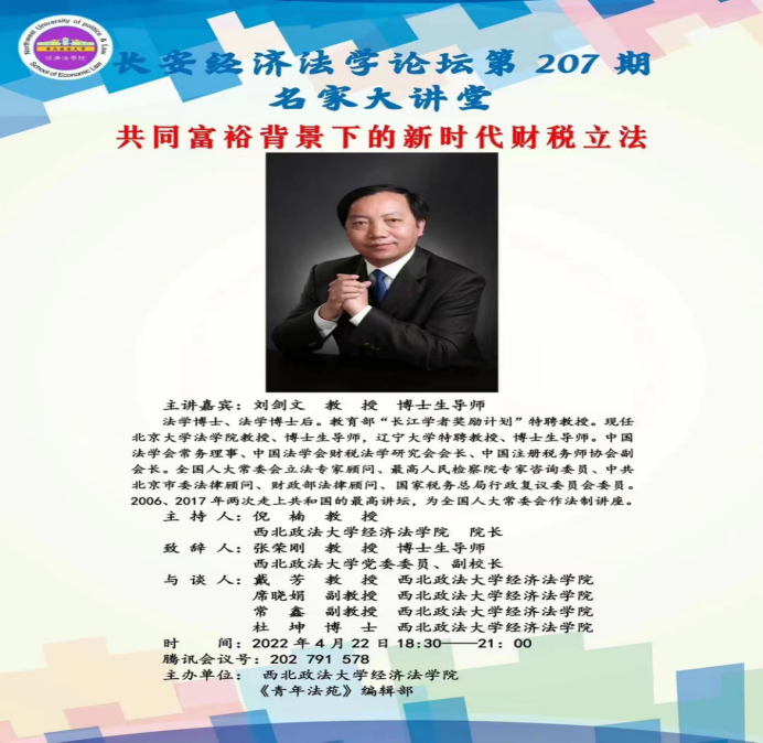 院长倪楠教授主持,北京大学法学院教授、博士生导师,辽宁大学特聘教授、博士生导师刘剑文教授主讲,西北政法大学党委委员、副校长张荣刚教授致辞,英超联赛88直播