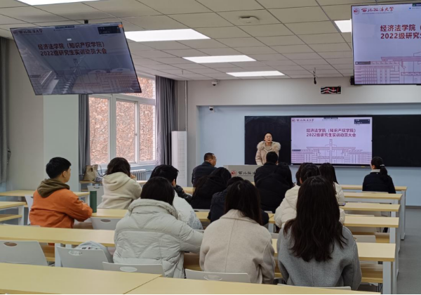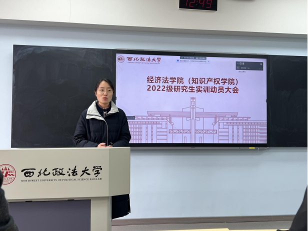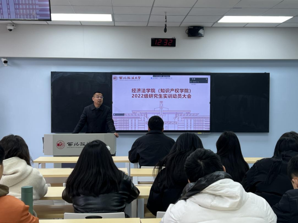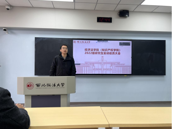 (知识产权学院)于3月1日中午在雁塔校区三号教学楼召开2022级研究生实训动员大会。学院副院长肖新喜教授、党委副书记李恒、教务办秘书徐靓及2022级全体研究生参会。研究生辅导员吕悦主持会议。