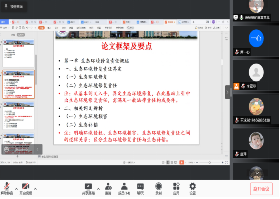 环境与资源保护法专业参加本次预答辩的学生共有20人,其中法学硕士13人,法律硕士7人。预答辩工作于2021年12月25日在线上分两组进行。第一组由李集合教授担任答辩主席,李永宁教授、王继恒副教授、李雅萍副教授、郝少英副教授、李亚菲博士担任答辩委员。第二组由薛亮副教授担任答辩主席,韩利琳教授、黄政副教授、丁岩林副教授、陈娟丽副教授、车东晟博士担任答辩委员。