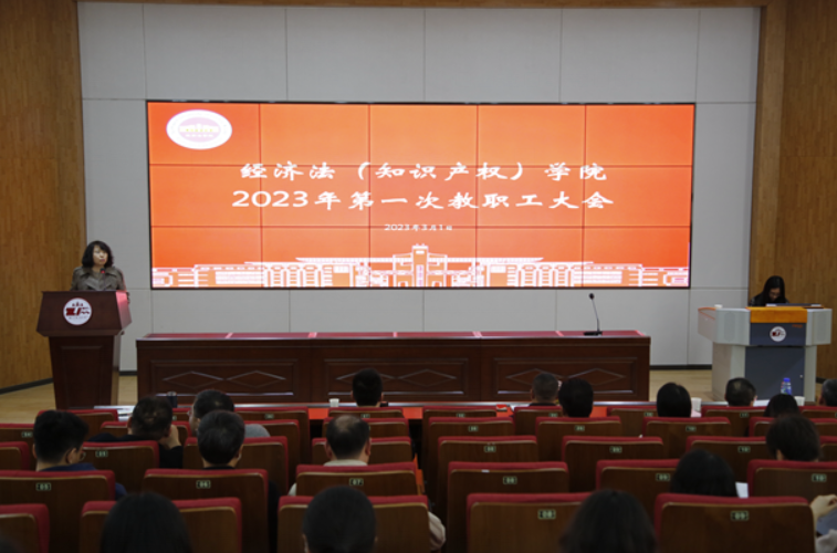 为推进2023年度各项工作高质量发展,3月1日下午,经济法(知识产权)学院在雁塔校区1号教学楼报告厅召开2023年第一次全体教职工大会,部署推进本年度重点工作。全体教职工参会。会议由学院党委书记李建梅主持。