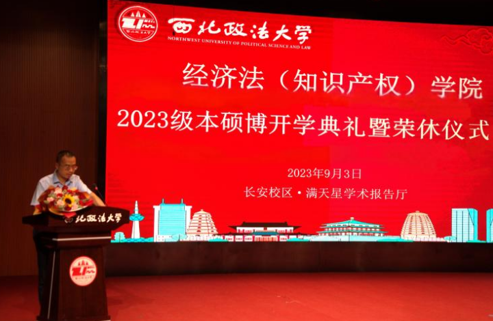 院长倪楠代表学院全体师生向2023级新同学表示热烈欢迎。他在院长致辞中详细介绍了经济法(知识产权)学院的发展历史与取得成绩,重点讲述了老延大精神与西法大红色基因,阐释了西法大育人理念和学院人才培养目标,并传授了大学期间如何读书的人生经验,期望同学们在求学之路上矢志不渝,不断追求卓越,挑战极限。