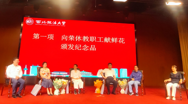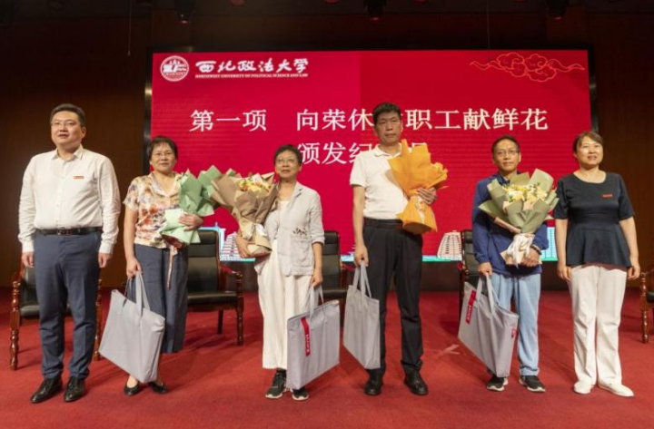 荣休仪式环节由经济法(知识产权)学院副院长肖新喜主持,此次荣休会邀请了学院近3年荣休的魏明英、牛晓艳、王振玉、曹中辉四位老师出席。党委书记李建梅、院长倪楠向荣休教职工献鲜花并颁发纪念品。