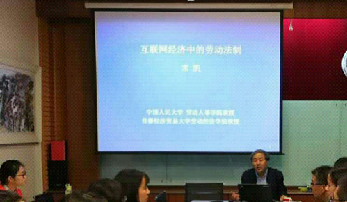 常教授深刻分析了互联网对用工关系产生的重要影响及其发生的重要改变:劳动关系主体、工作地点、时间、工作内容等更加灵活和多样;在劳资力量对比上,雇主控制力的增强,员工组织成本的减少;在调整方式上,结构碎片化和分散化,调整个别化和单向度等等。虽然互联网对用工关系产生了一定影响,但互联网并未改变雇佣关系的基本性质。雇佣关系的基本特征是劳动对于资本的从属性:在劳动关系主体上,劳动和资本仍是两个性质不同的要素;在双方追求上,资本追求利润(财富权)、劳动追求工资(生存权);在双方关系上,职业从属、经济从属、人格从属、社会从属仍然存在。所以,互联网经济下的劳动法律规制要区分职业性和非职业性两种不同的用工形式,分别适用不同的规制方式,进一步完善现行劳动法律规定,修改相关的劳动标准,完善和明确政府、雇主和劳动者三方的权利义务,使之适应于互联网经济中新的劳动关系形式。常教授还就相关问题与两位与谈人充分交流意见,并与同学们共同分享了他的科研经验以及对劳动法学习的体会。最后,会议在热烈气氛中结束。