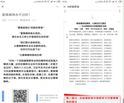学院还通过班级微信群、年级公众号等载体组织广大学生学习疫情期间涌现的“雷锋榜样”、感悟新时代的“雷锋精神”。2017级5班张怡静同学说:“在现在这个特殊时期,雷锋精神是全国四万医护人员星夜兼程奔赴武汉的奉献精神;是科研人员不舍昼夜奋力研发的艰苦奋斗的精神!” “看着最近的逐渐下降的数字,那是全国人民的胜利,是每一位中华儿女身体力行践行的雷锋精神的成果。” 2019级经济法4班邹嘉丽同学谈到。同学们用文字讲述着抗疫故事,用心感受疫情下的雷锋精神,向抗疫英雄们致敬,并坚信疫情防控的阻击战在党的领导下一定能够打赢。