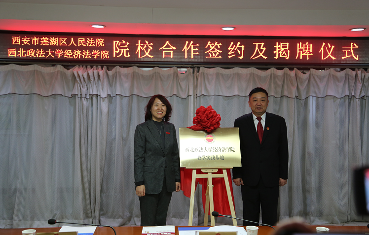 李建梅与莲湖区法院院长刘群共同为“英超联赛88直播 教学实验基地”揭牌。