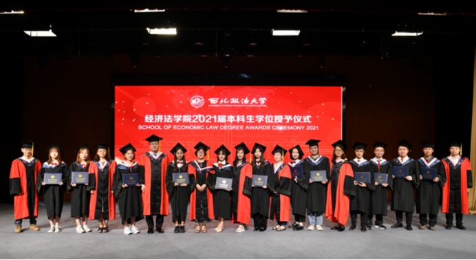 2020届314位毕业生法学学士学位的决定》。学院领导和全体教师代表为获得学士学位的毕业生挑理流苏、颁发学位证书并合影留念。