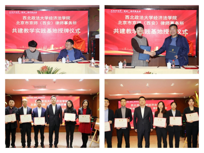 义海忠教授、院长倪楠、团委书记王文一行5人莅临北京市京师(西安)律师事务所参观交流。双方就共建教学实践基地达成一致意向,举行合作签约、授牌、聘任仪式;并围绕校企文化、党建合作、人才培养、发展前景等方面展开深入交流。