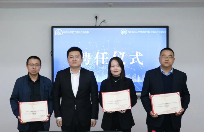 (知识产权学院)实务导师”的聘书,律师代表兰景龙律师、李雪雅律师、冯智慧律师接受聘书。