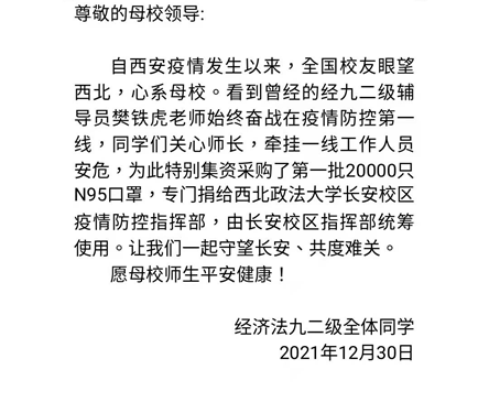 师恩难忘,母校情深。12月31日,在西安新冠肺炎疫情防控最关键的时期,英超直播88 九二级全体校友共同集资,向母校捐赠20000只N95口罩,尽显校友情深,用实际行动助力母校打赢这场疫情防控攻坚战!