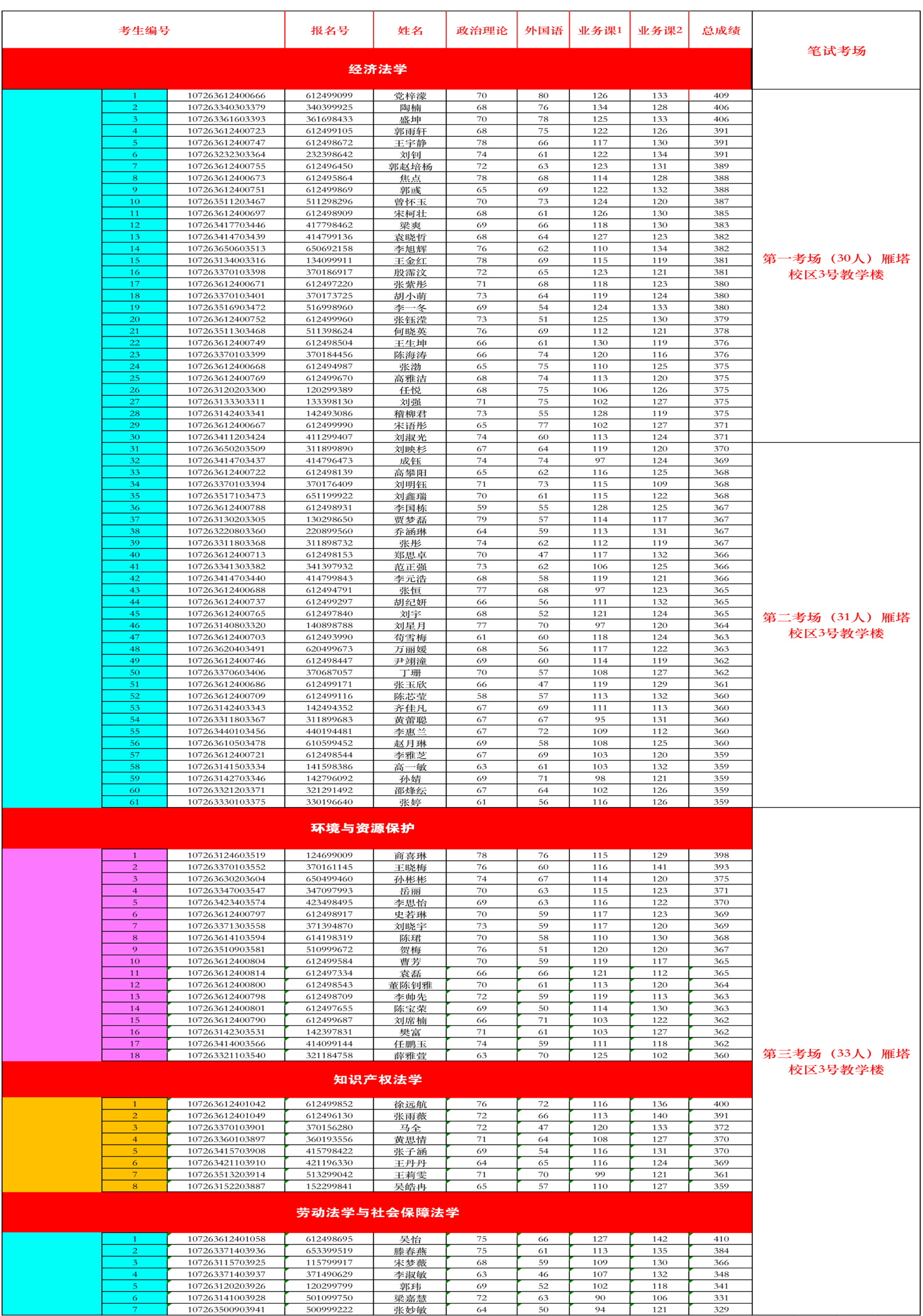 (1)经济法学: 雁塔校区3号教学楼。第一组****教室;第二组****教室,学生下午提前半小时到达等候教室确定分组 (2)环境与资源保护法学、知识产权法学、劳动法学: 雁塔校区3号教学楼****教室,学生下午提前半小时到达等候教室抽号。 |