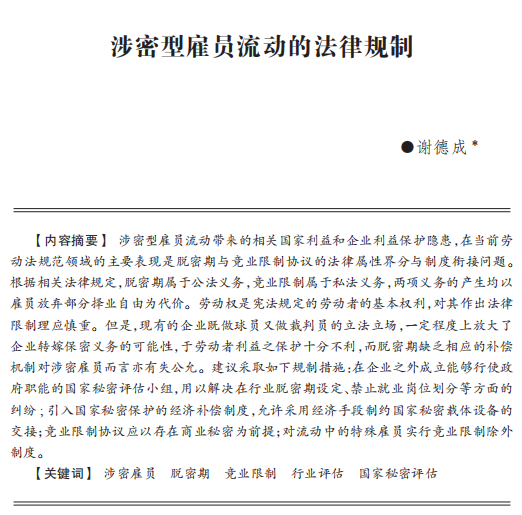 【法学】谢德成:涉密型雇员流动的法律规制