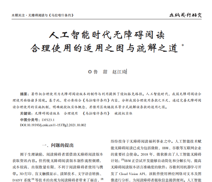 人工智能时代无障碍阅读合理使用的适用之困与疏解之道_鲁甜; 赵江琦.pdf