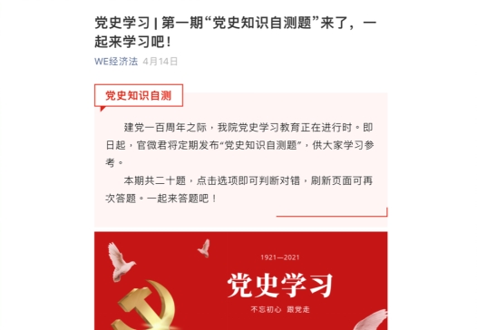 2021年3月2日,学院公众号推出系列推送【党史学习|党史百年天天读】栏目,每天更新党史学习资料,截至目前已连续推出文章65篇。该栏目内容转自公众号共产党员在“重要论述”“党史回眸”“历史瞬间”三大板块中图文并茂地分享了重要讲话精神、历史节点等多项内容。自4月14日学院公众号还推出了“党史知识自测题”,供全院师生学习参考,为迎接中国共产党百年华诞回顾党的光辉历程创造了条件,营造学党史、知党情、跟党走的浓厚氛围,进一步丰富党史学习教育内容,以实际行动践行初心使命